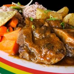 Savor the Flavor of Jamaica, This classic dish is rich in history and taste. Braised "Jerk" Oxtail, slowly cooked to fall-off-the-bone served our JG Beef Patty, roasted potatoes, carrots & Jamaican Rice